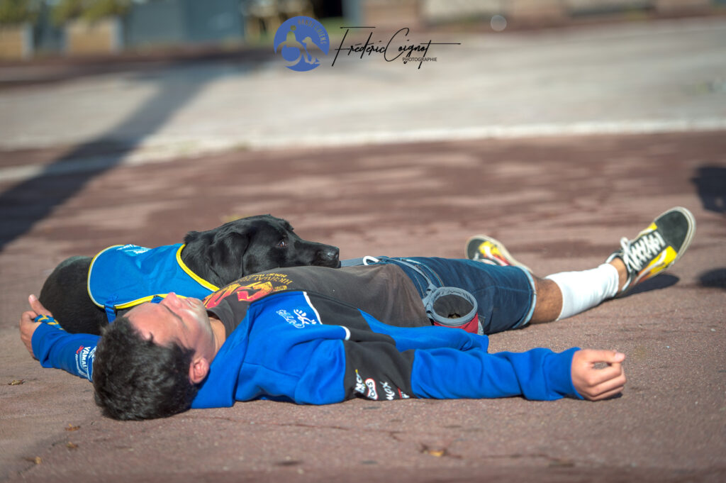 - Pendant la crise, le chien va se coucher, s’allonger à côté de la personne dans le but de l’apaiser, de lui permettre de ressentir un point de pression et de lui apporter un réconfort. Il peut poser sa tête sur la cuisse ou sur le buste de la personne. Le chien peut également appuyer sur un bouton ou buzzer qui alertera la famille de la crise en cours.